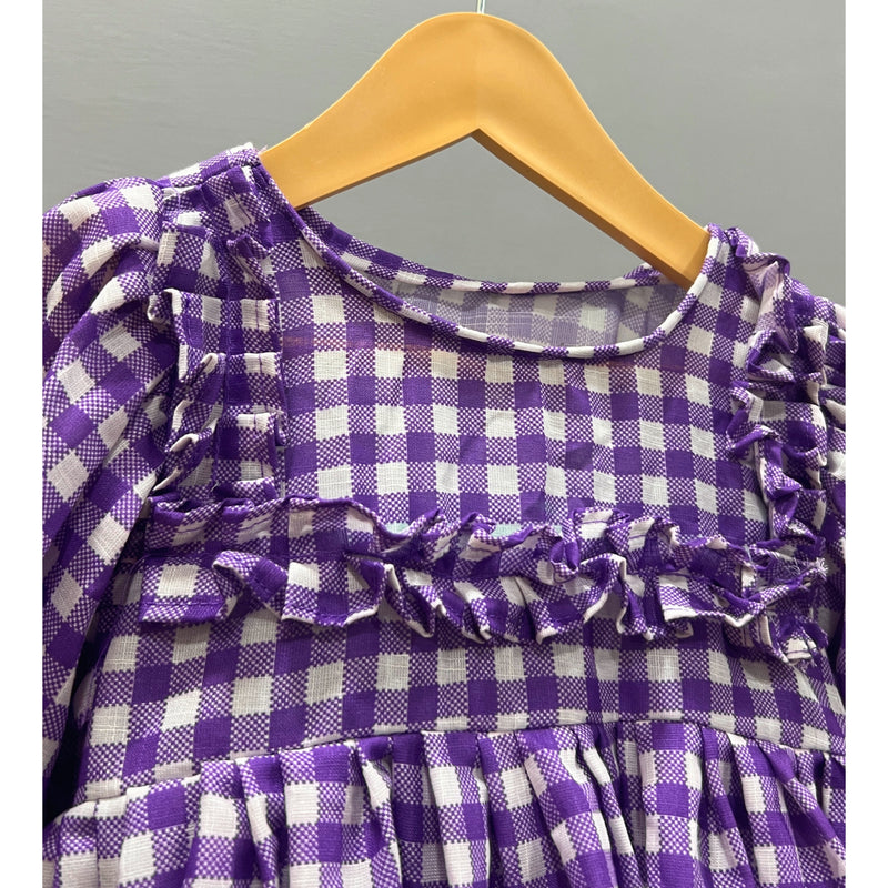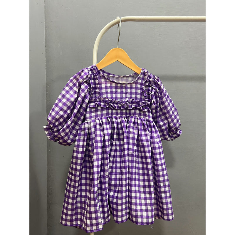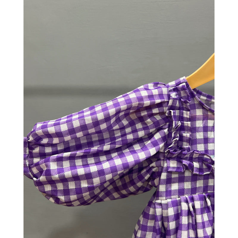 It is cute high neck waistline frock, of the front side of the dress - a small ruffle is constructed in a box shape. The elbow sleeve is emphasised with a bishop sleeves.