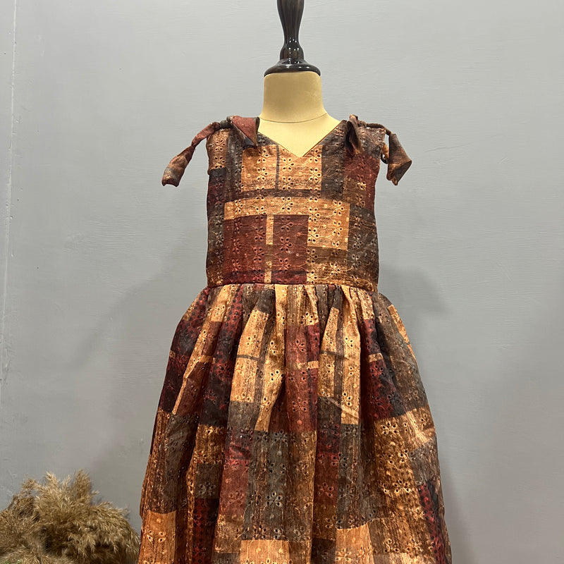 It is a below knee length frock designed has a sleeveless waist-line frock in a V-neck model. It can be tied up in the shoulder which comes with rope and tassels.