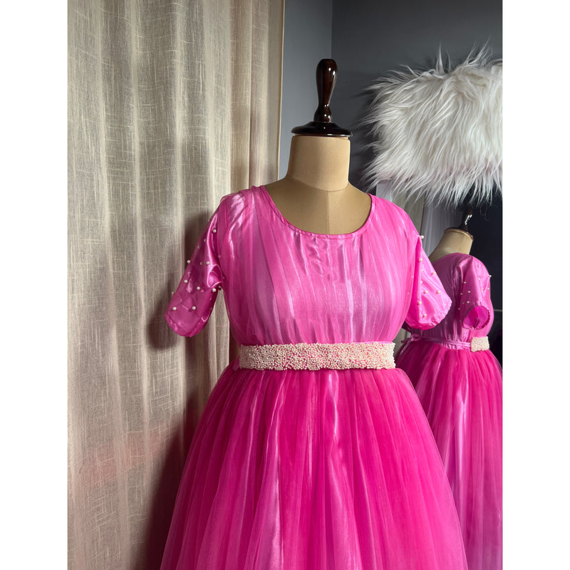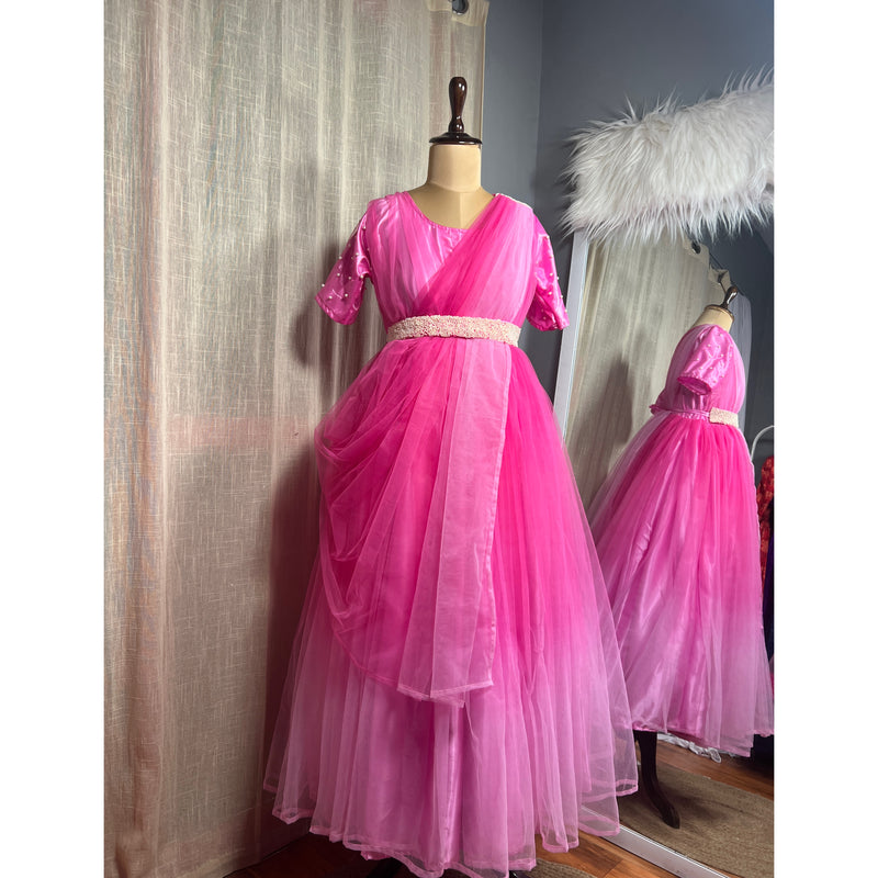 We've made waist-line gown, in the top part on the front portion we've given neatly pleated finish and have made elbow sleeves. To enhance it more we've given beautiful pearls. and also we're giving perfectly pearl finished waistband separately and to add more we're also giving pleated shawl with pearls on it to draped it separately as well. Made this dress with 3 layers of lining with can can.