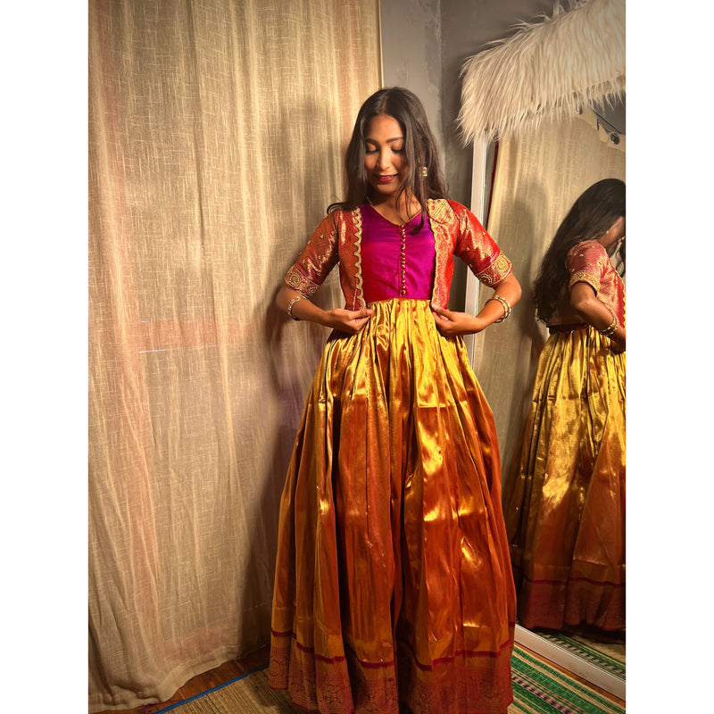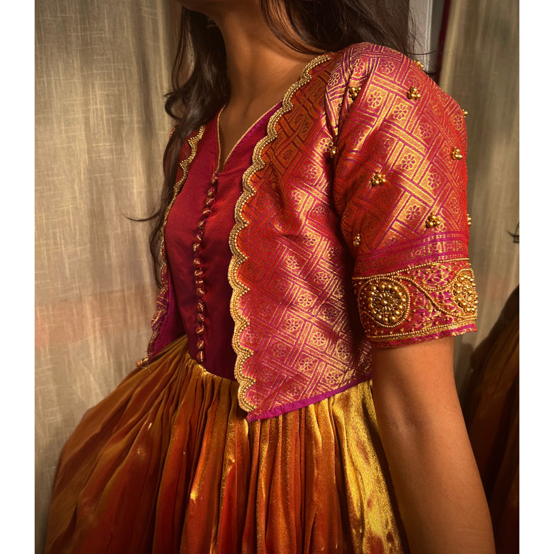 The beautiful two piece detachable festive wear is designed in the model of v-neck waistline traditional gown, which is embellished with pom pom in the front position of the gown and to give more attractive look we’ve given beautifully scalloped Aari worked waistcoat, which will give stunning look for all the traditional occasions of yours!