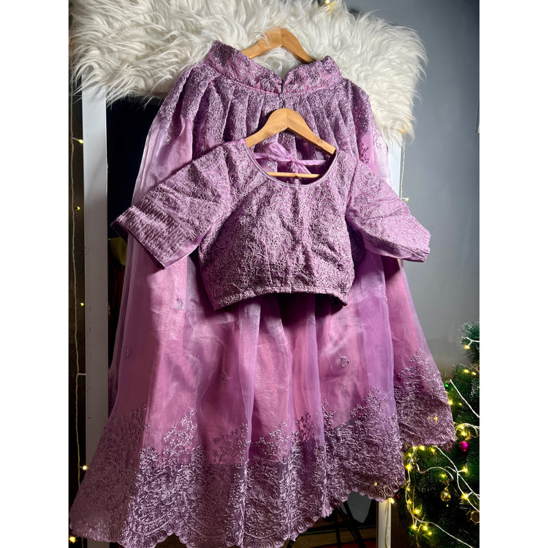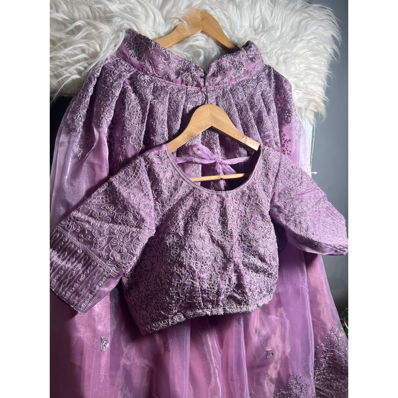It is a embroidered lavender colour set comes with a pleated skirt, in which we're giving side zip and hooks attached for easy wearing and for the Crop top it has round neck in the front and U-shaped neck in the back attached with rope and tassels to give the perfect fitting and we've given hooks to wear it easily.