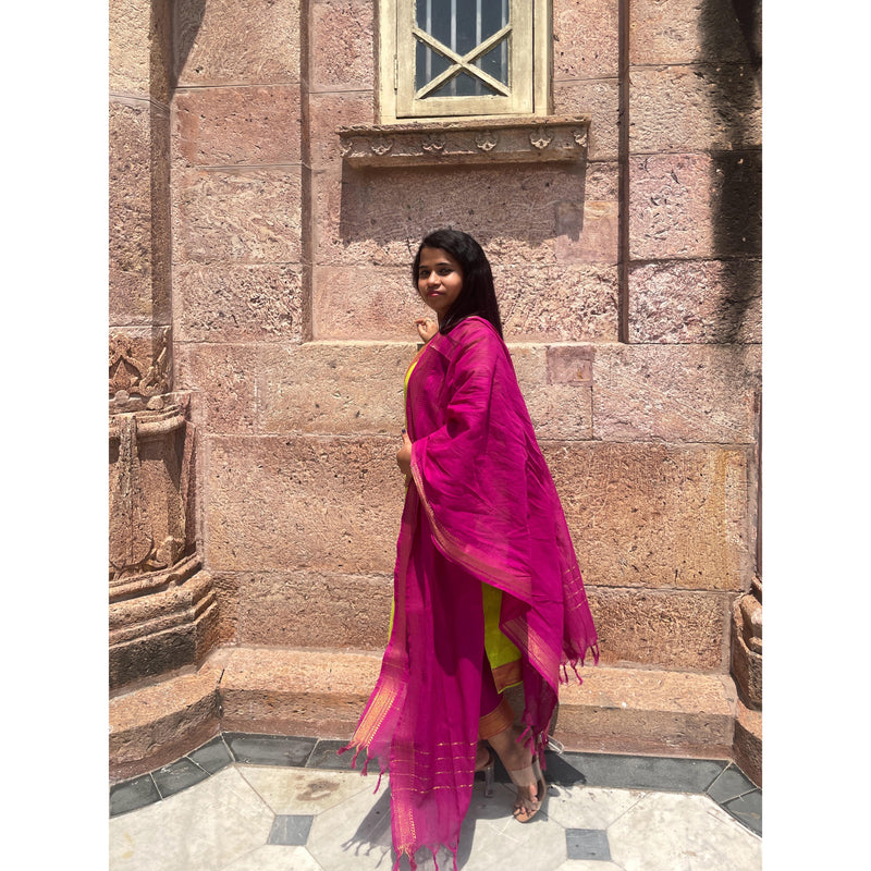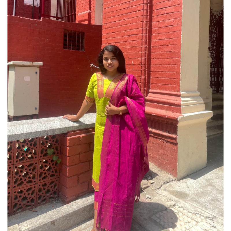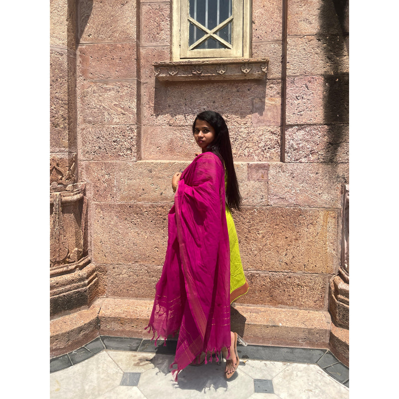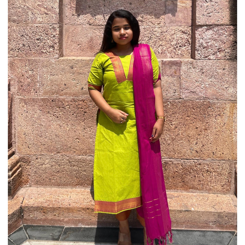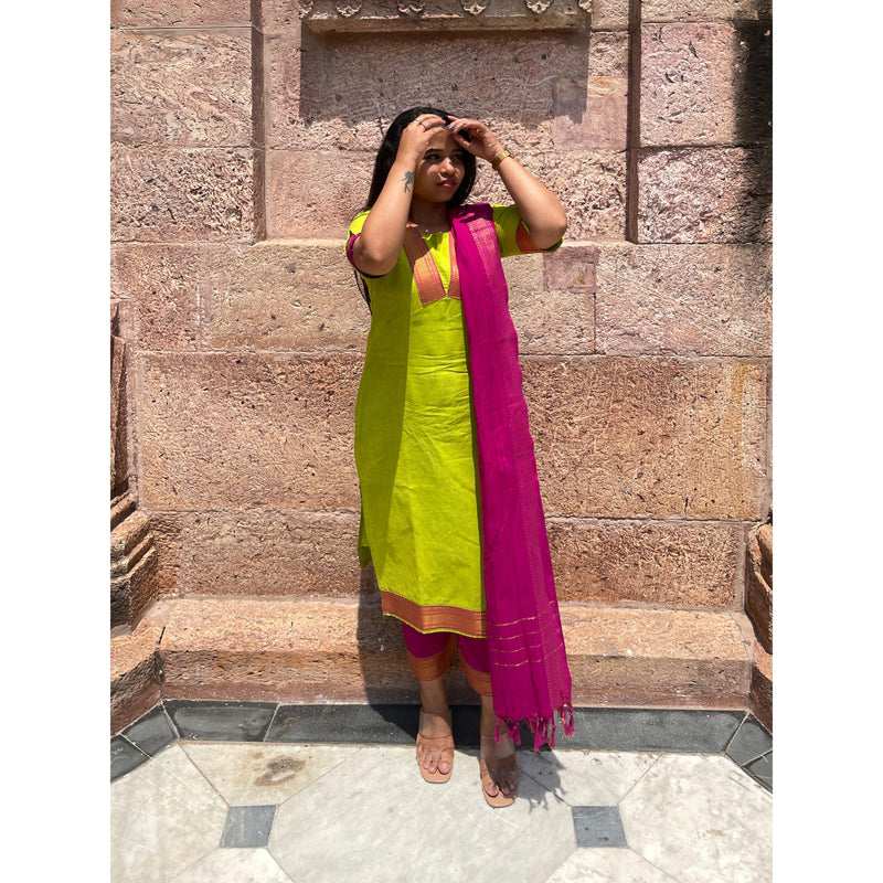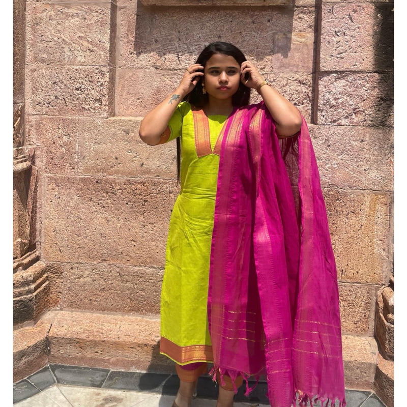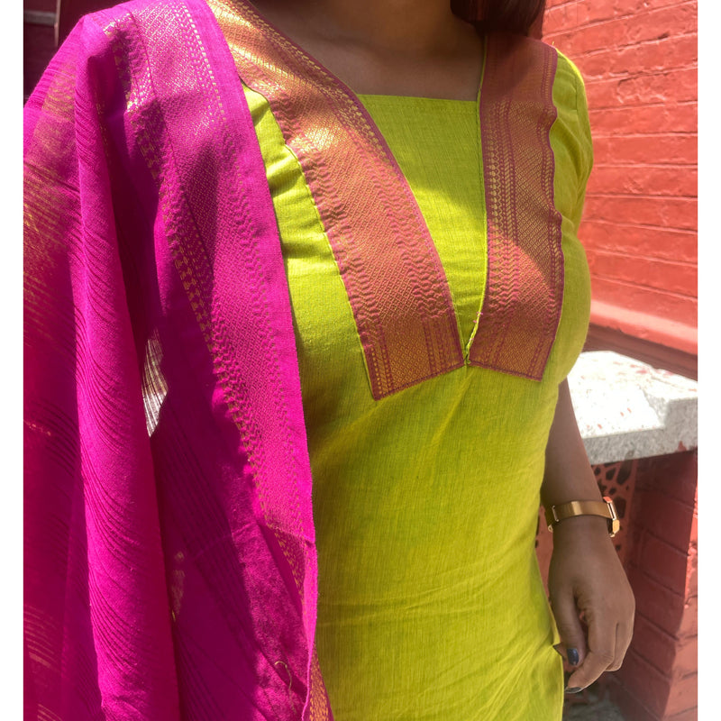 The Handwoven Mangalagiri cotton neon and pink colour combo set for all the traditional occasions. In the top position we've given box V-shaped pink border neckline to give absolute traditional feel. In the sleeve position we've given bow like module with V-shaped cut work design, the same border comes in the down position of the top as well. The set comes with pink trouser and pink traditional dupatta.