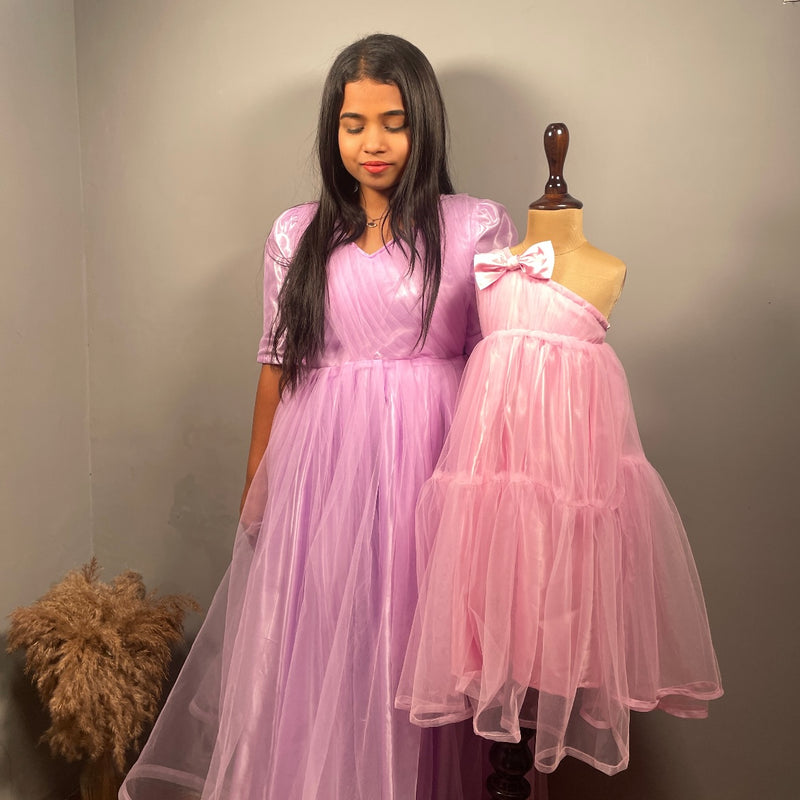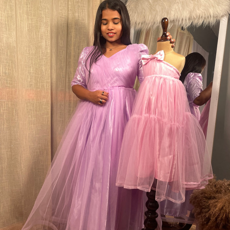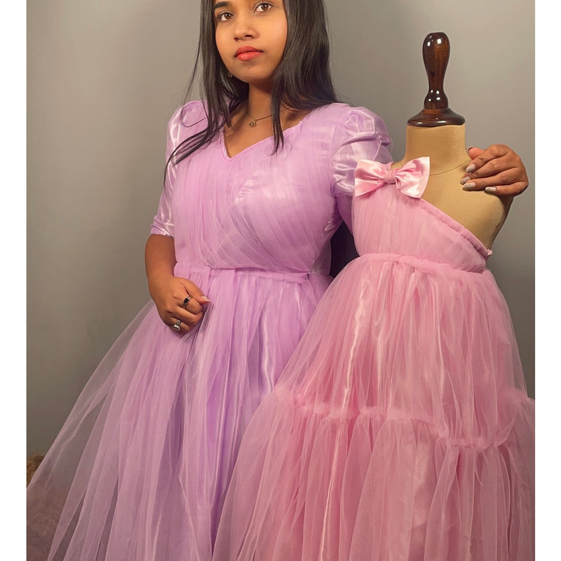 The princess combo comes with an pleated adult net dress with fully satin lined and the kids dress comes with an off shoulder net fabric attire lined with satin.