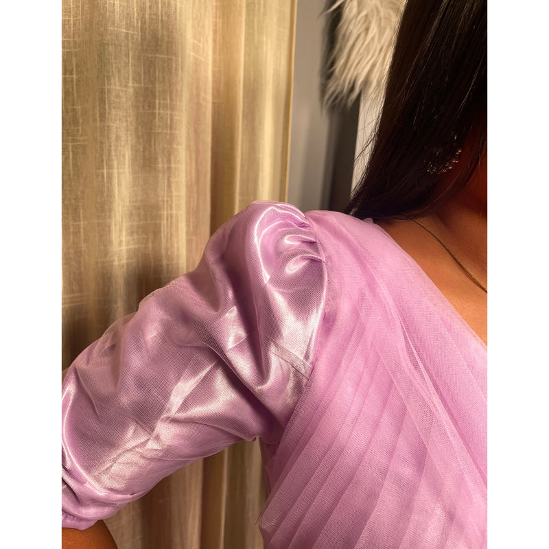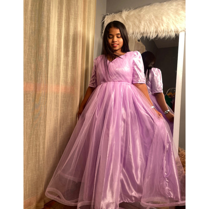 the top layer has fully pleated work and the gown finishing part has horse braid attached