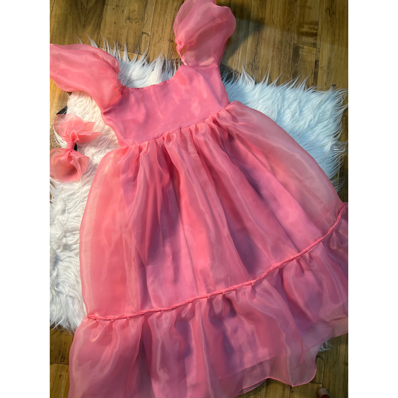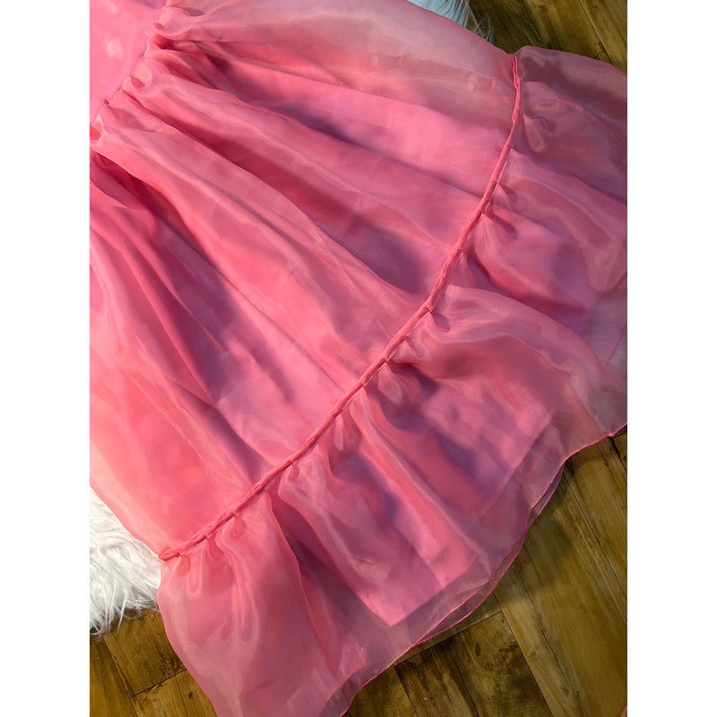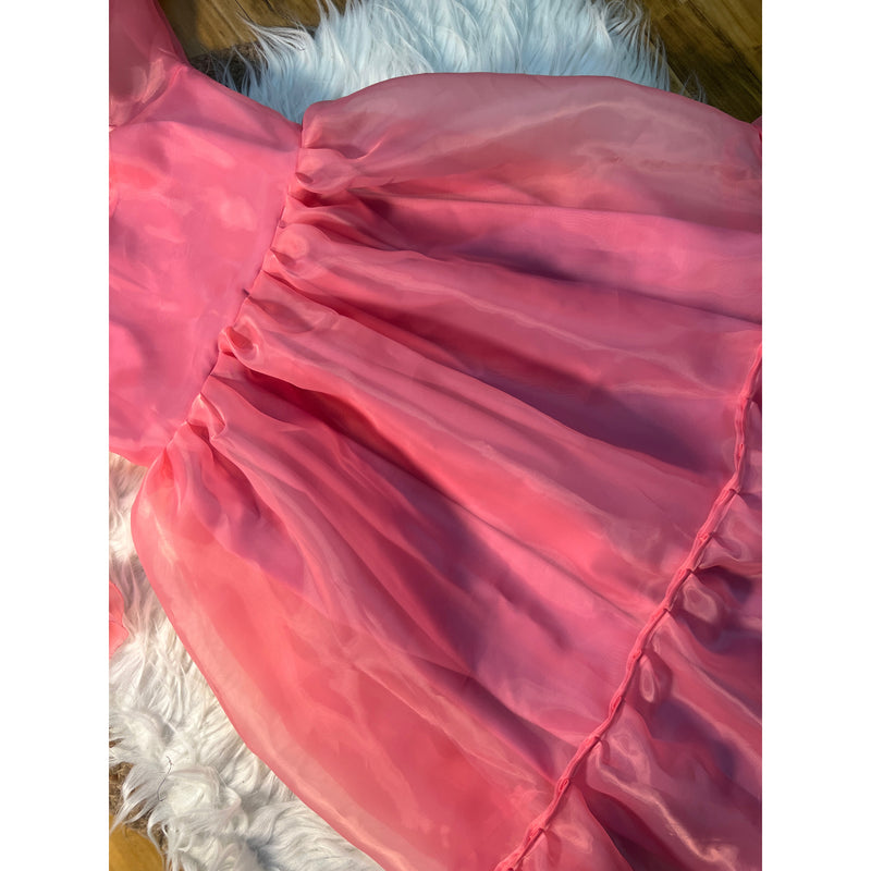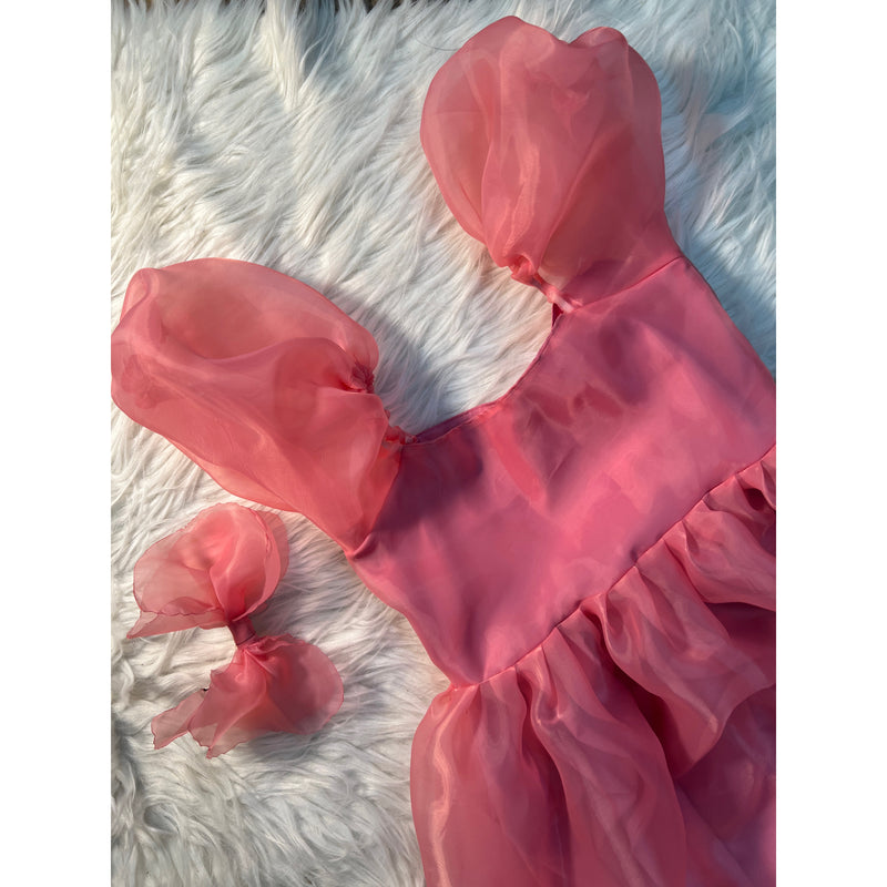 The dress is made up of pure organza fabric which is constructed above till ankle length and we've given one layer of tier in the down position and elevated the attire which raglan sleeves, which also comes with a bow.