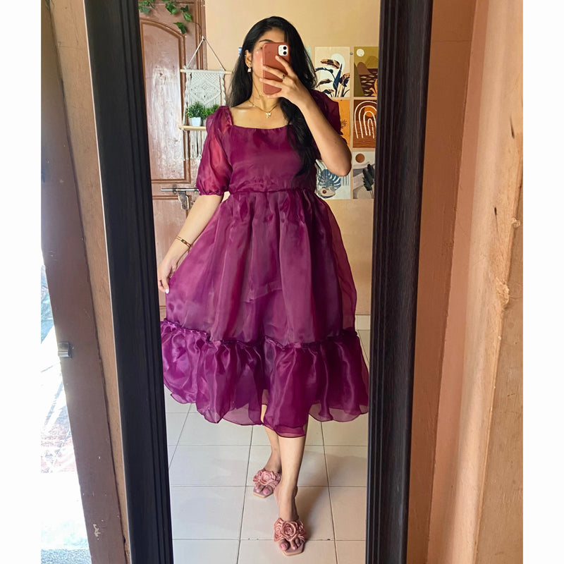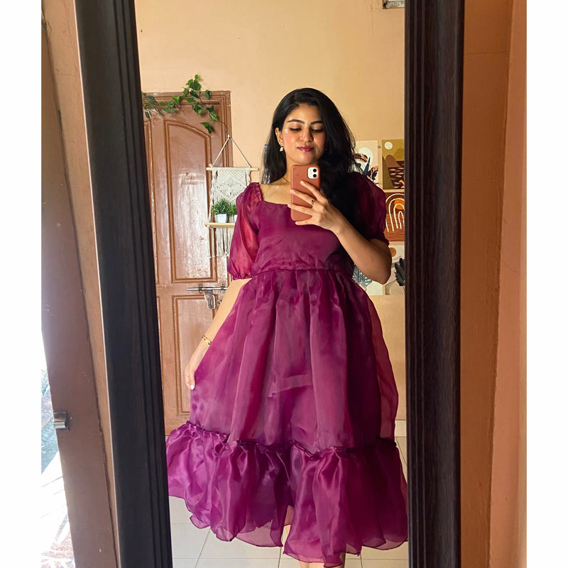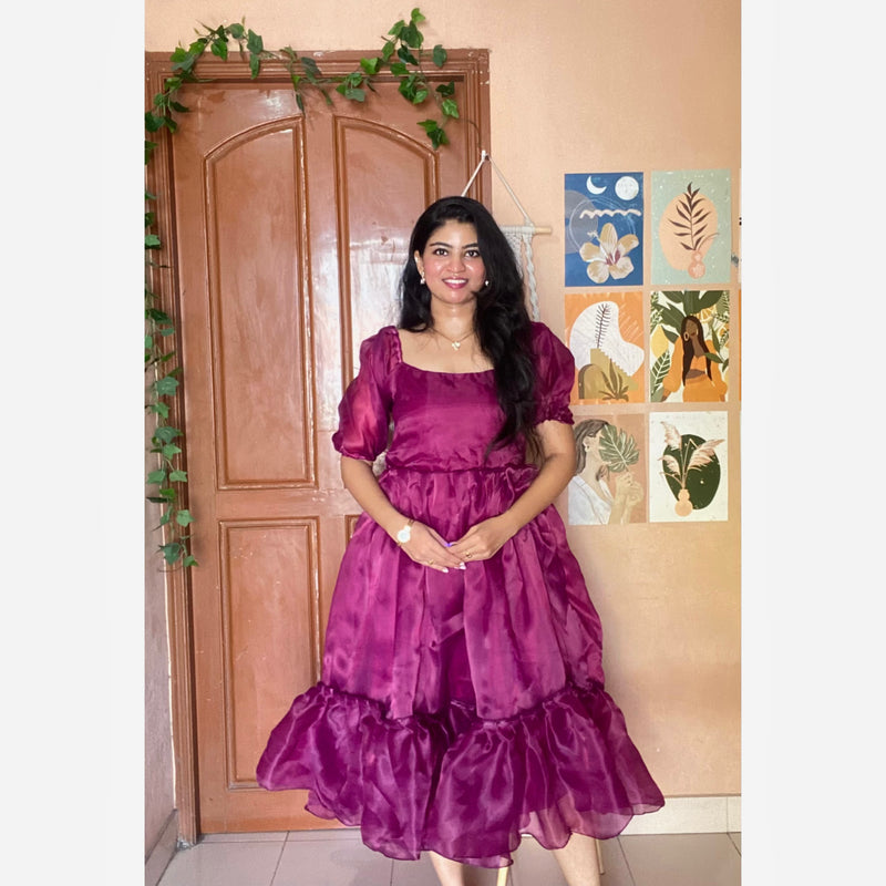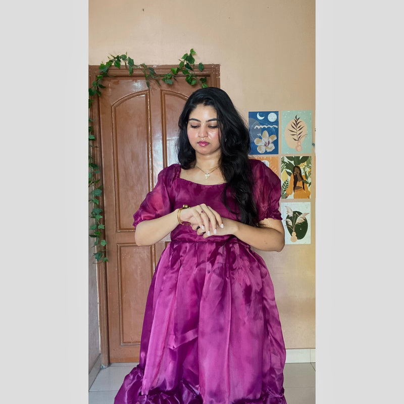 The dress is made up of pure organza fabric which is constructed above till ankle length and we've given one layer of tier in the down position and elevated the attire with raglan sleeves, which also comes with a bow.