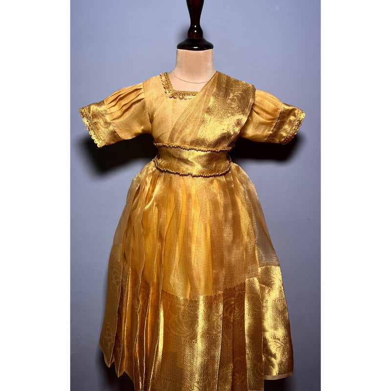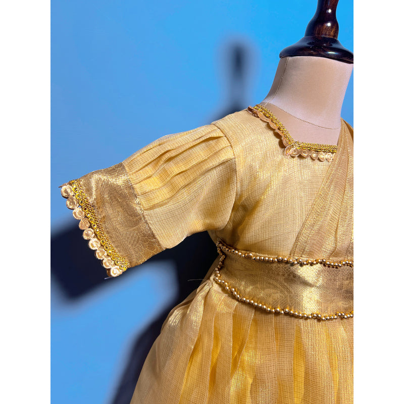We've given box neck and attached coin like lace and have given big puff sleeve and attached coin like lace. For the down part we've given box pleats to enhance the dress overall.