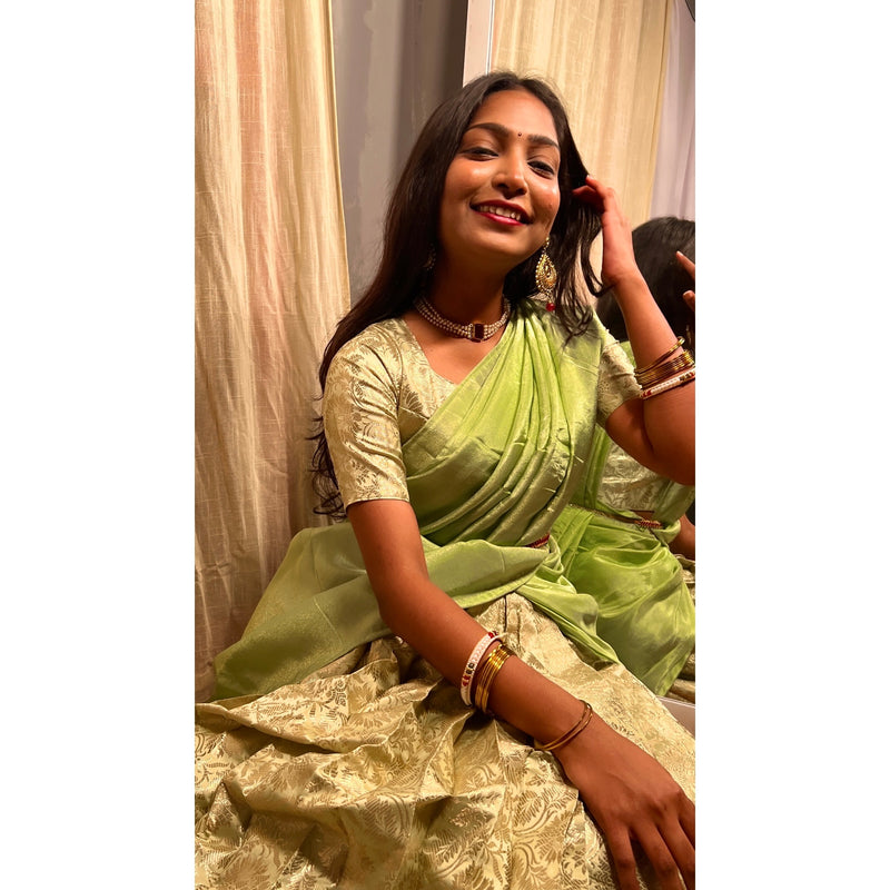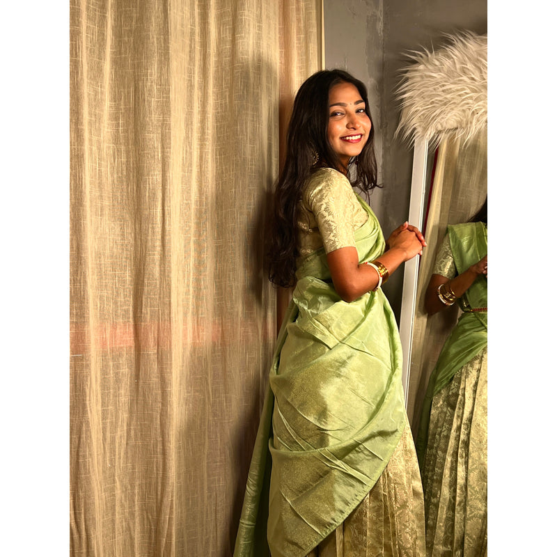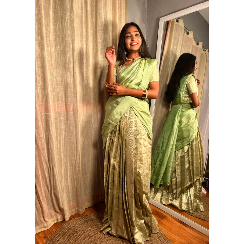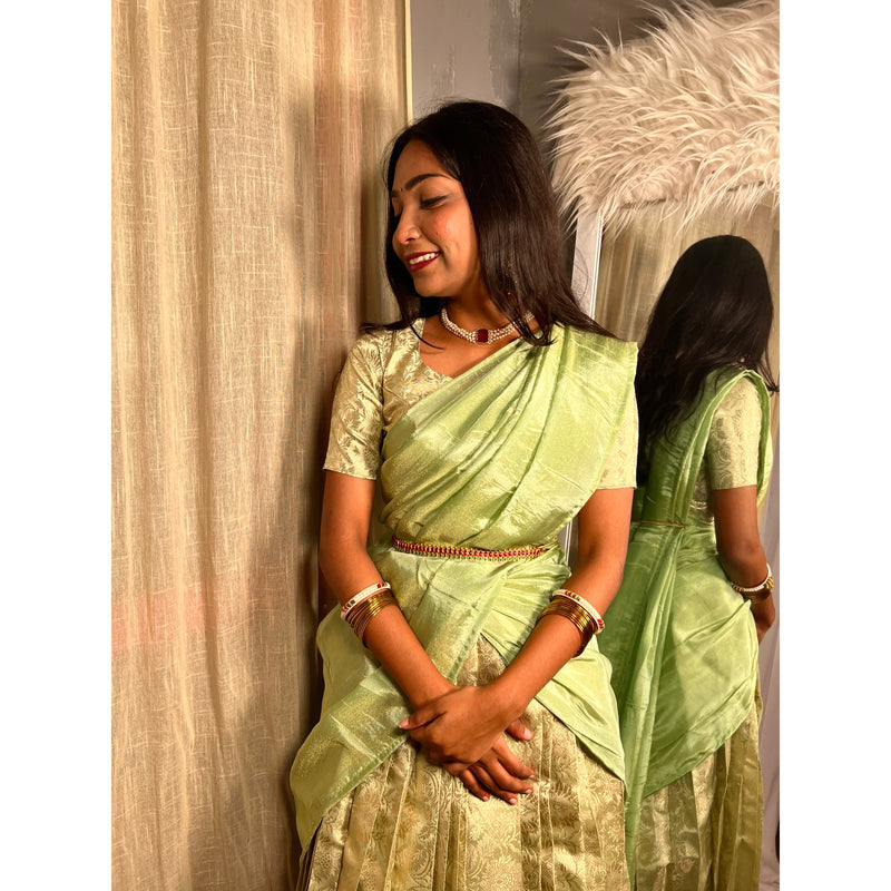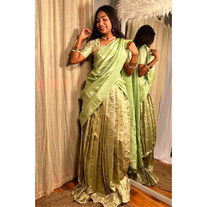 The traditional half saree is made up of Banarasi silk and for the draping we've given chinon silk dupatta.
