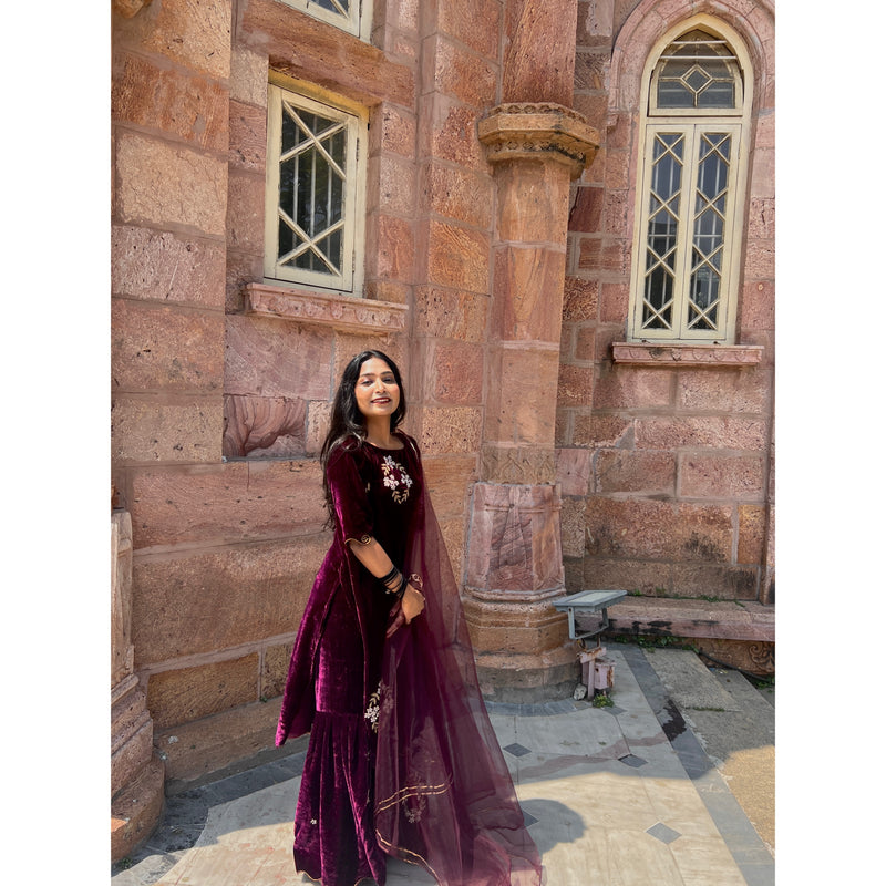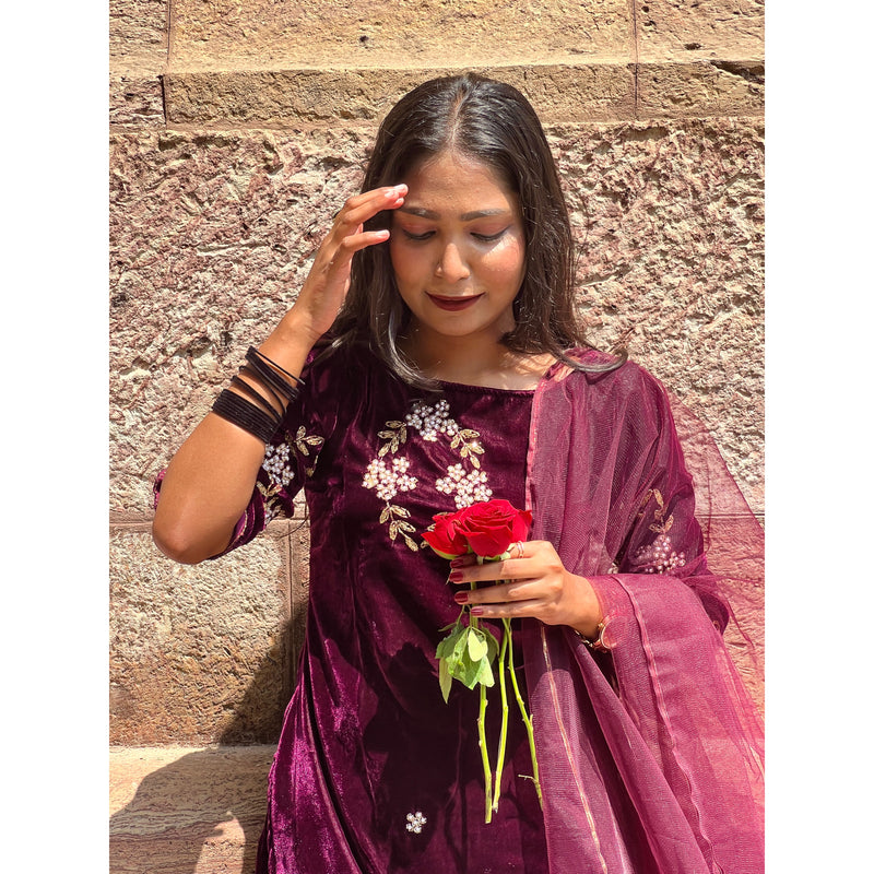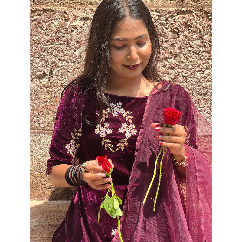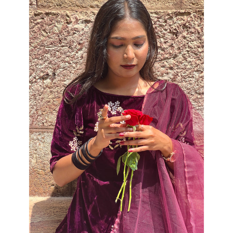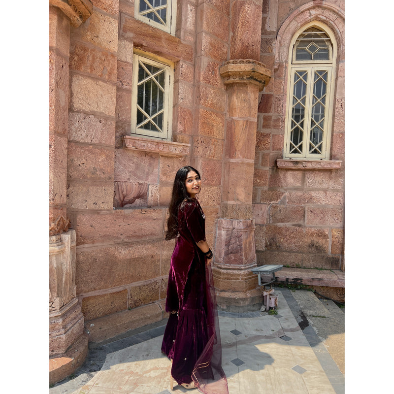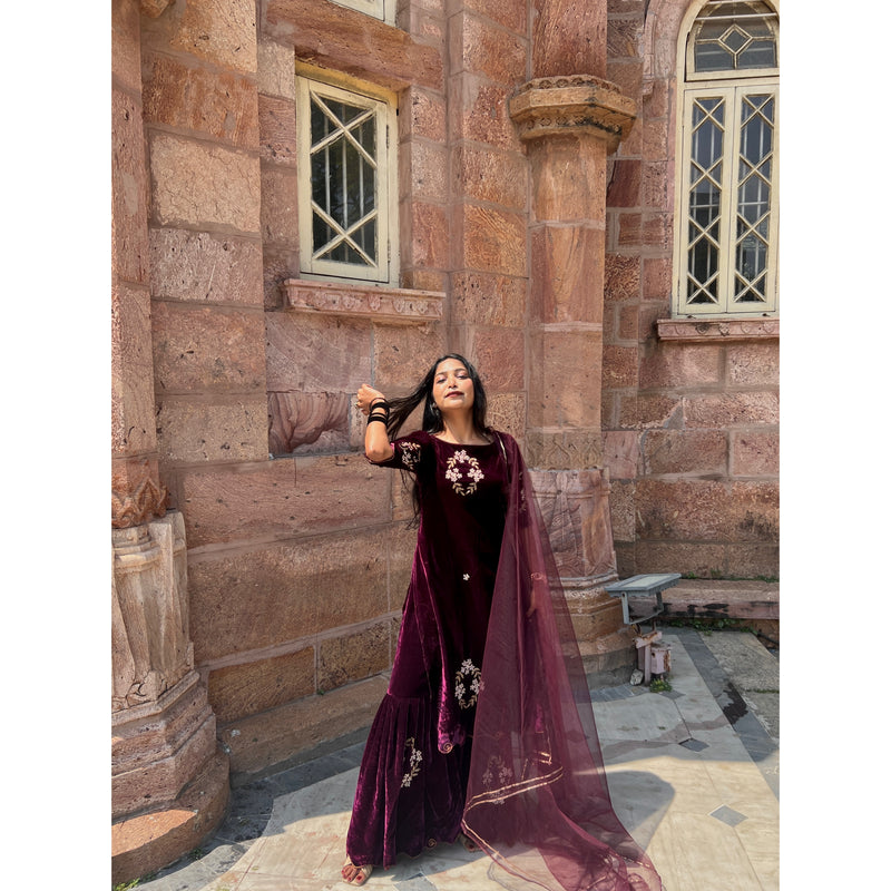 The royal velvet Sharara suit. We’ve opt the wine colour velvet fabric to make this attire which embellishes with beautiful hand Khatli cutdana work along with fancy arco cut border which comes in the sharara pant, elbow sleeves, and in the kurta top. The set also comes with 2.5m of net lace worked dupatta as well.