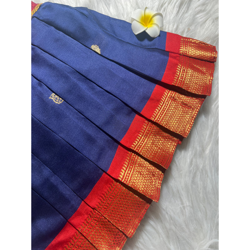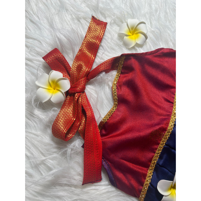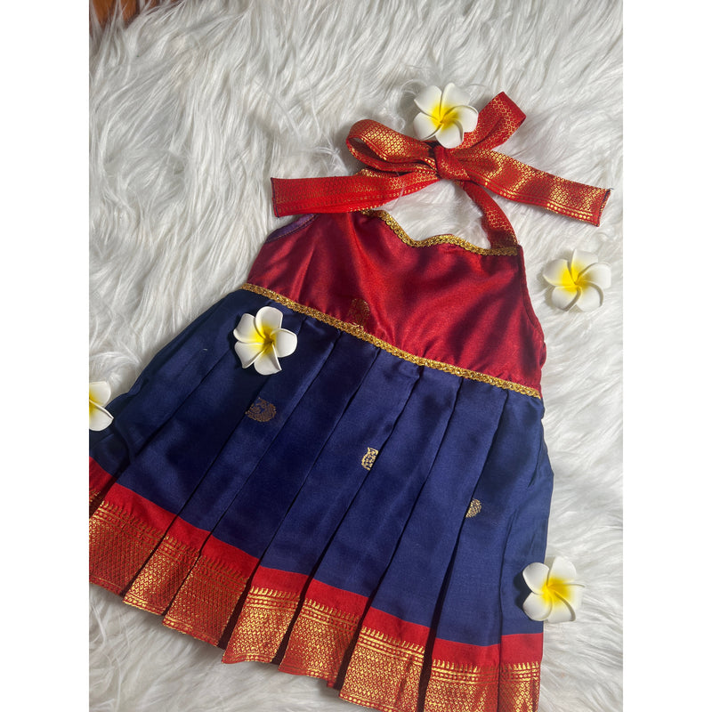 We've designed the yoke part of the dress in red colour and have given ropes in the shoulder to support the dress, and also we've given lace work in the neck position and for the down position we've blue colour combination with red border and have given box pleats.