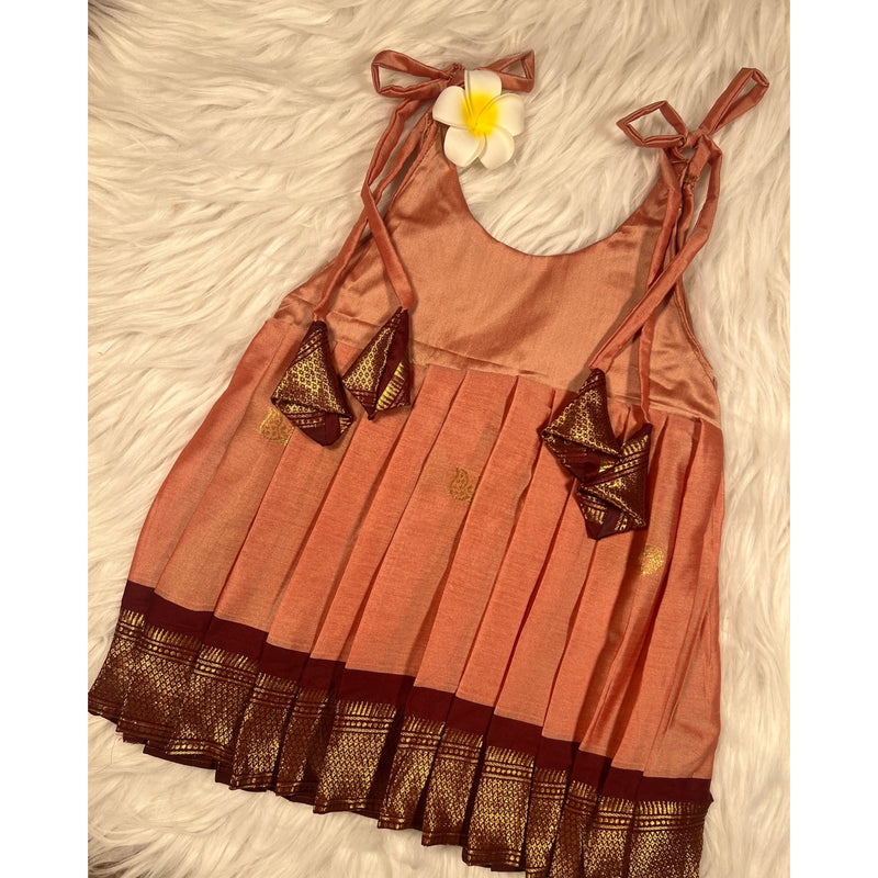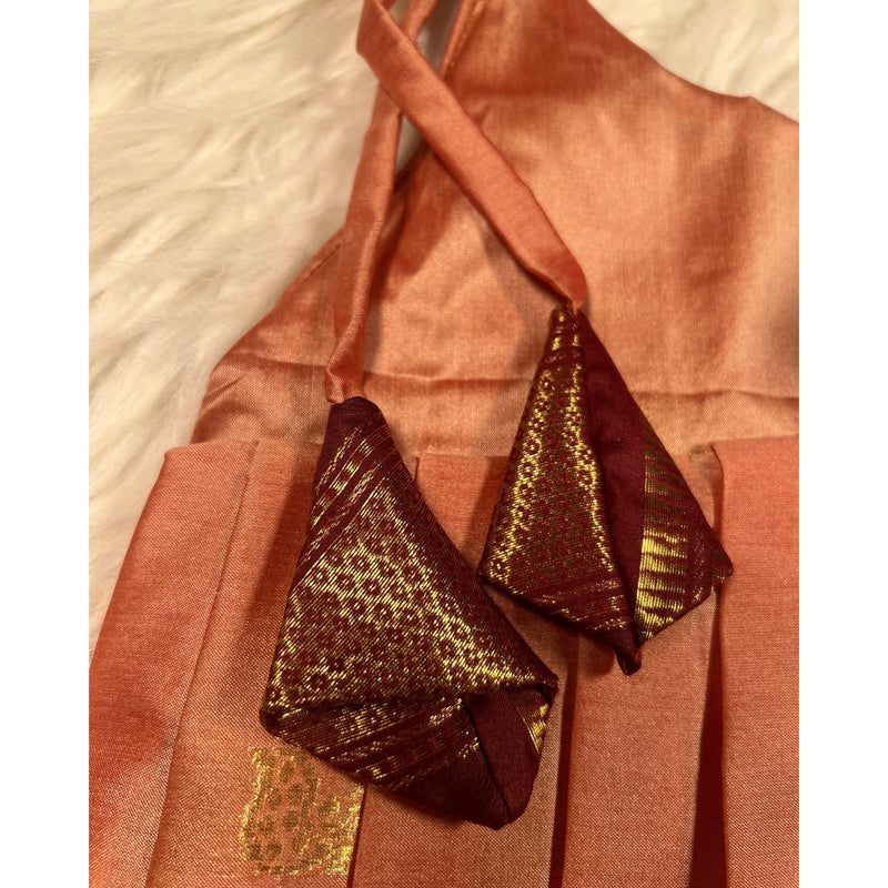 We've designed the yoke part of the dress in red colour and have given ropes in the shoulder to support the dress, and also we've given lace work in the neck position and for the down position we've blue colour combination with red border and have given box pleats.