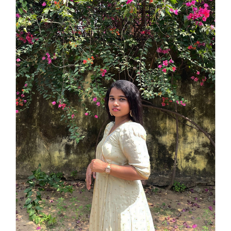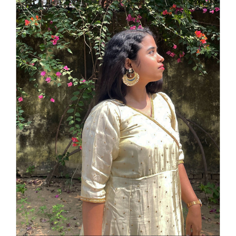 The outfit is made up of white soft chinon silk fabric. We've designed the attire has a 8-panel gown module. For the neck position we've given wrap like finish with lace attached to give it for a elegant finish and with this we've given ropes to tie it up with pillow like tassels attached to it and we've given pleated elbow sleeves.
