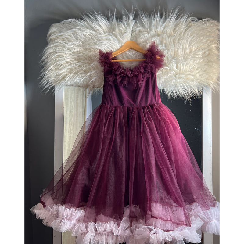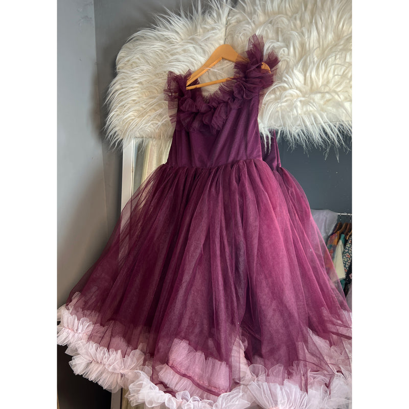 The dress is made up wine colour of net fabric. which comes with beautiful layers of ruffle in the neck and the down part. In the down part we've given ruffle in the pink shade to give a unique style.